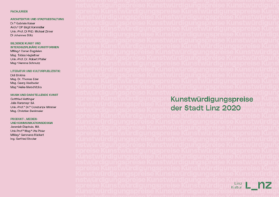 Über die Auszeichnung mit dem Kunstwürdigungspreis der Stadt Linz 2020, dürfen sich em. O.Univ.-Prof. Mag.arch. Roland Gnaiger (ehemaliger Leiter der Architektur an der Kunstuniversität Linz), O.Univ-Prof.in Mag.a Ursula Hübner (Leiterin des Bereichs Malerei & Grafik an der Kunstuniversität Linz), Christian Steinbacher, Wolfgang "Fadi" Dorninger (Lehrender im Bereich Zeitbasierte Medien an der Kunstuniversität Linz) und Michi Gaigg freuen.