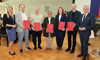 v.l.: Kulturstadträtin Doris Lang-Mayerhofer, Christian Steinbacher, Wolfgang "Fadi" Dorninger, Michi Gaigg, Ursula Hübner, Roland Gnauger, Bürgermeister Klaus Luger © Tips