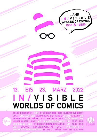 In der Doppelausstellung werden künstlerische Positionen von 16 Studierenden der Kunstuniversität mit Comics von Kindern und Jugendlichen, die im Rahmen des Sommerprogramms der KinderJugendKreativUni 2021 entstanden sind, gezeigt.