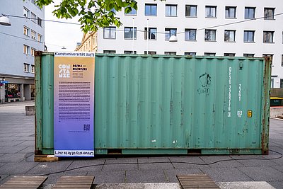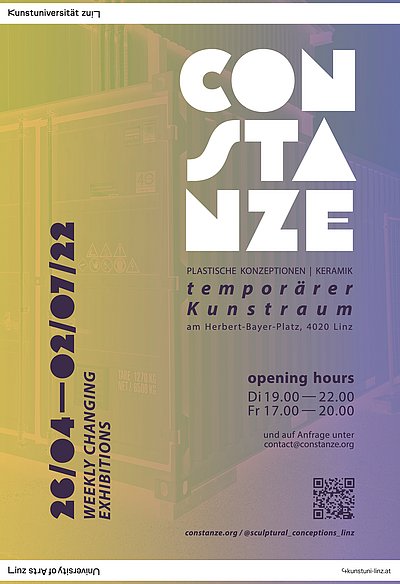 Am Asphalt sind sie gestrandet. Zwei Seecontainer. Der Anlegeplatz weit vom Wasser verschoben. Dichte Stahlkonstrukte konfrontieren mit neuem Raumgefüge. Bis das nächste Ladeschiff, Anfang des Sommers, zur Ursprungsfunktion aufruft wird hier ein temporärer Kunstraum erschaffen. Mit insgesamt neun wöchentlich wechselnden Ausstellungen zeigen Studierende der Abteilung Plastische Konzeptionen/Keramik der Kunstuniversität Linz wie Hartes, Flauschig, Weichgekochtes, Pastellig Überkreuzendes, sinnlich Formloses bis zum Siedepunkt generiert werden kann. Freitags ertönen überdies rund um die Stahlkisten Soundgefüge, Geräusche und Wortfragmente. Es werden geladene Klangerzeuger*innen, Körperformationsmenschen und stille Massen in die Dämmerung schwimmen, solange bis die Pforten der Kisten verschlossen werden, um am darauffolgenden Dienstag in neuem Kunstlicht eröffnet zu werden.