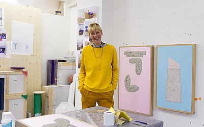 Maruša Sagadin ist eine in Wien lebende Künstlerin, die sich mit Objekten und deren Performance im Raum auseinandersetzt. Sie arbeitet viel mit Symbolik und stapelt schon mal ein Herz und abstrahierte Schuh- oder Fußformen zu einer Säule mit dem Titel “Das Herz in der Hose”. Wie schon bei Hansje van Halem kommt auch hier eine selbstbewussste Künstlerin zu Wort, die sich zu grellen und poppigen Farben bekennt.