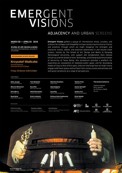 EMERGENT VISIONS gathers a group of international artists, curators, and scholars for dialogue and thoughtful critique concerning the diverse frames and practices through which we might recognize the emergent and evocative visions, affects, and practices potentiated in and around urban screens. Hosted by The School of Art, Design and Media at Nanyang Technological University, with support and collaboration from Indiana University and the School of Arts, Technology, and Emerging Communication at University of Texas Dallas, this symposium provides a platform for expanding our conceptions of mediated public space, and for developing modes of inquiry that reflect upon, and even challenge how we might newly engage with these spaces and surfaces – from various scales and contexts and with great sensitivity to a range of perspectives.