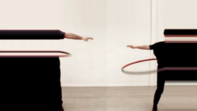The hula hoop, generally used as performative object or as entertainment, is brought here into an everyday, “uninteresting” space, in which it is completely stripped of its usual significance. The hula hoop twirling executed by the two characters standing face to face visualises the continuous influence that we exert, willy-nilly, over our personal space, thus becoming a symbol of the continuous exchange of invisible flow of energy. Only the circular movement, almost meditative in its repetitiveness, is common to the vicious circle and the hula hoop, and thus can turn an error into a vice.