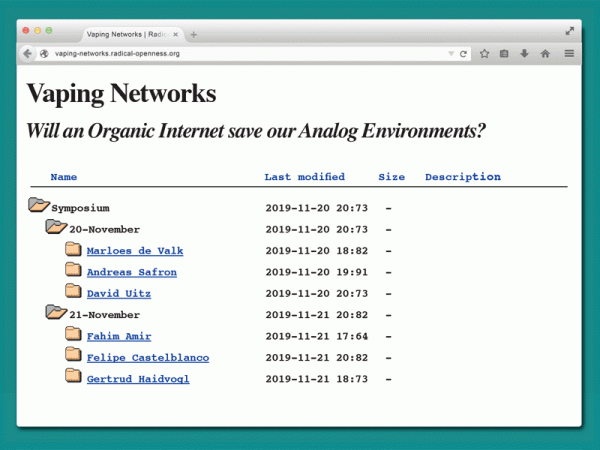 The aim of the symposium “Vaping Networks” is to analyse the intersection of digital and analog environments and extend the discussion on technological development with the tools from the discipline of ecology and from the eco- activist practice.