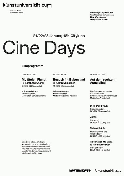 Cine Days ist eine dreitägige Veranstaltungs,- und Diskussionsreihe, der Abteilungen Zeitbasierte Medien und Ästhetik und Pragmatik audiovisueller Medien im Linzer Moviemento & City-Kino, in der aktuelle Filme gesehen und zusammen mit den Filmemacher*innen diskutiert werden.