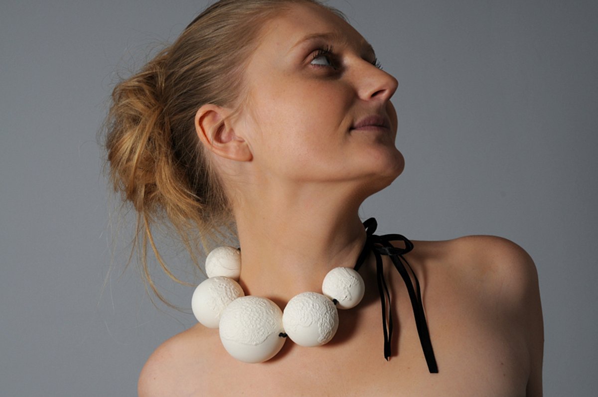 In ihrer Bachelorarbeit "Leben aus dem Feuer", nimmt Weizhao Li Bezug auf den Mythos Phönix, indem sie in die Gestaltung symbolische Elemente integriert. Mitunter geht es ihr dabei um die Verflechtung von einem Schal und Schmuck zu einer untrennbaren Einheit. Durch die Geschmeidigkeit des Schals ist der Schmuck besonders anpassungsfähig und schmiegt sich leicht an die Konturen des Körpers an. Die Symmetrie und Haltung, sowie die Bewegung des Körpers, hat einen wesentlichen Einfluss auf das Tragen und die Wirkung des Schmucks. Die intensiv glänzenden Oberflächen der transparent glasierten, halbkugeligen Porzellanformen, besitzen die Eigenschaft, Licht einzufangen und gleichsam zu reflektieren, um es an die, diesen Schmuck tragende Person weiter zu geben.