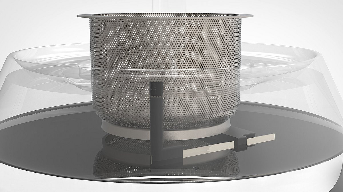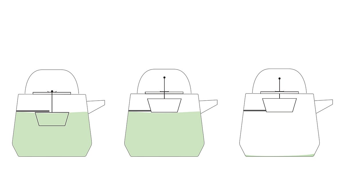Konzept 2: Bei der Zubereitung von Grüntee schadet eine zu heiße Wassertemperatur dem Aroma des Tees. Ein Bimetallstreifen, der an der Kanne angebracht werden kann, lässt das Teesieb erst in das heiße Wasser fallen, sobald die vorgesehene Wassertemperatur erreicht ist.