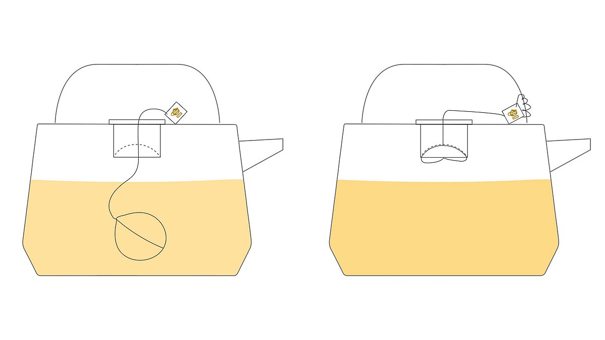Konzept 1: Eine kleine Adaption am Konzept des Teebeutels mit großem Nutzen: Dabei wird die Schnur des Teebeutels an dessen innerer Unterseite befestigt. Wenn beim Herausnehmen des Teebeutels an der Schnur gezogen wird und der Beutel dann auf einen Widerstand trifft (z.B. den Deckel der Kanne), wird der Teebeutel ausgedrückt. Somit ist kein zusätzlicher Löffel zum Ausdrücken nötig.