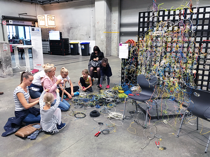 Mit buntem Draht und Leuchtdraht ließen Studierende und Lehrende gemeinsam mit hunderten BesucherInnen im Bereich des U19 Create Your World eine Skulptur wachsen. Im Vordergrund stand die Kommunikation mit anderen Menschen und dem speziellen Material durch das ungleichzeitige Tun am Objekt. Durch diesen einfachen Beteiligungsprozess wurde Gemeinschaft und Individualität erlebbar und sichtbar.