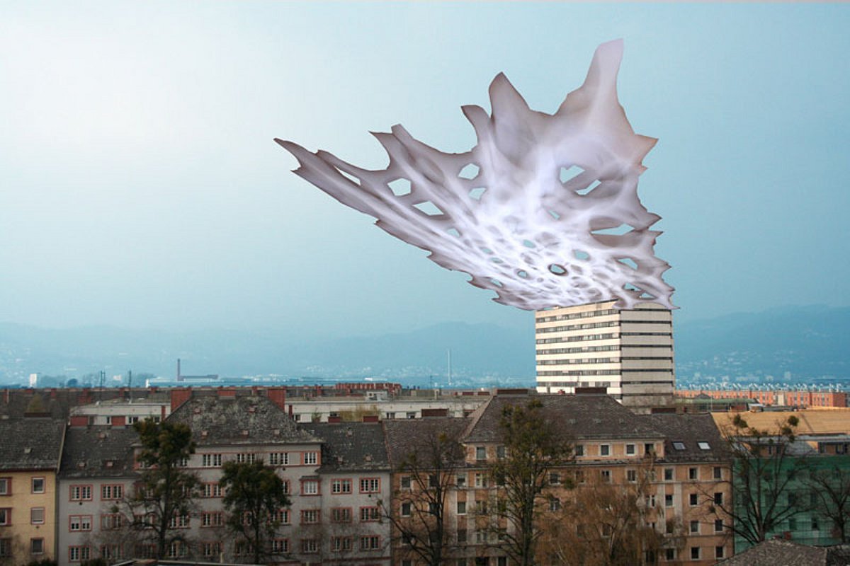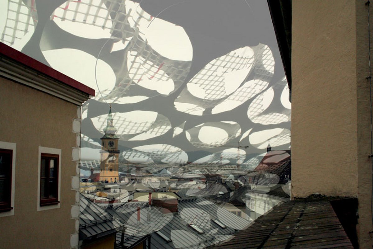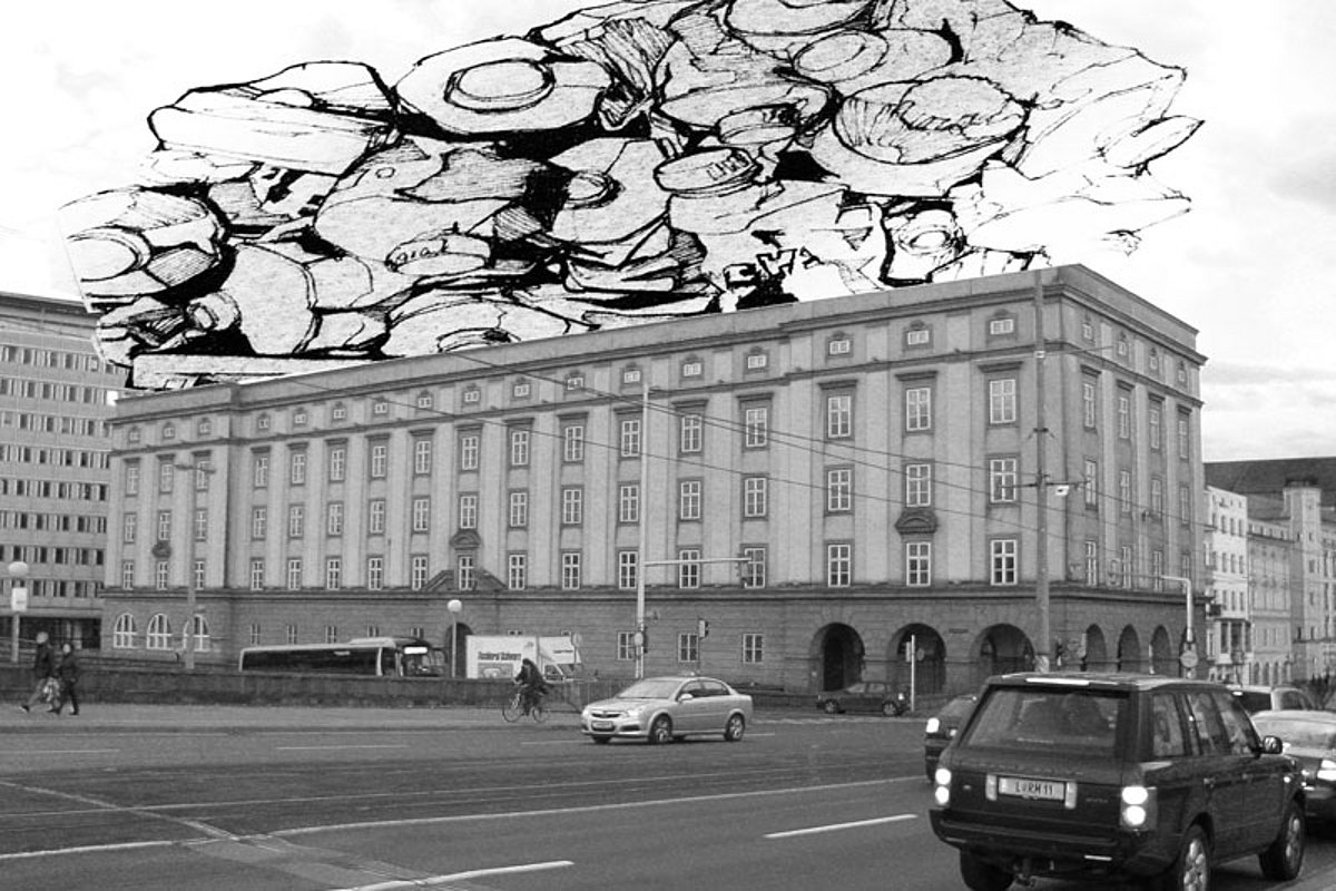 In unserer Projektarbeit lauten die Themen unter anderem: Dekoration, Information, Kommunikation, Illusion, Allusion bzw. beschäftigen wir uns in diesem Zusammenhang auch mit der 5. Fassade, dem Dach. Zwei Aspekte sind dabei interessant: die Verwendung der Dachlandschaften als Objekt der Bespielung, der Manipulation, als Bühnenraum und die Thematik an sich, um eine künstlerische Installation im städtischen Umfeld zu schaffen, die einen neuen Objektraum beschreibt. Somit fokussieren wir den Blick auf eine keineswegs flache oder gar eindimensionale Landschaft, die sich im Alltag unserem Blickwinkel entzieht.