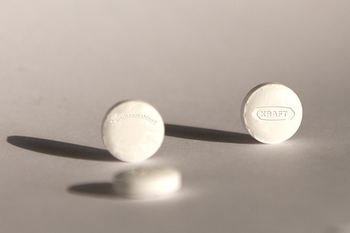 Die Arbeit besteht aus vier Fotografien, Morgen, Mittag, Zwischenmahlzeit und Abend. Auf die fotografierten Tabletten habe ich mit Hilfe von Photoshop Logos von Lebensmittelkonzernen appliziert. Die entstandenen „Lebensmittel - Tabletten“ verbinden Lebenmittelindustrie mit Pharmazie. In einer Tablette sind alle Nährstoffe, in der richtigen Dosierung, enthalten, So ist eine gezielte Ernährung möglich. Stichworte dazu sind functional food und Astronautennahrung. Durch die Logos erhalten die sterilen Tabletten eine sinnliche Komponente: Im Kopf des Betrachters entstehen Assoziationen zu den einzelnen Firmen, bei IGLO zum Beispiel ein dampfendes Schlemmerfilet.