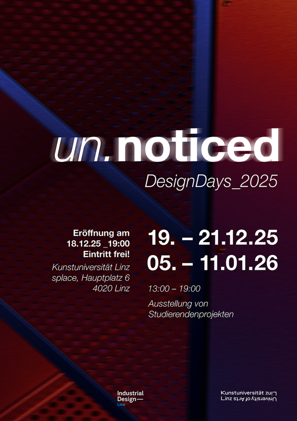 Die Ausstellung thematisiert das Spannungsfeld zwischen Sichtbarkeit und Unsichtbarkeit, zwischen dem, was wahrgenommen wird und dem, was verborgen bleibt. Gezeigt werden Projekte, Prozesse und Prototypen aus zwei Jahren Industrial Design an der Kunstuniversität Linz.