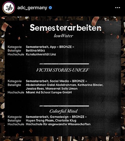 Die im Rahmen der Lehrveranstaltung Digital 2 - "Daily Helpers" entwickelte  App "lowWater" von Masterstudentin Bettina Mörz gewann beim ADC-Junior Award (Art Directors Club Deutschland) in der Kategorie "App" den Bronzenen Nagel.