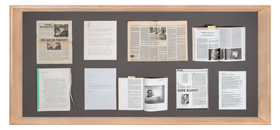 The current display cases show a selection of correspondence and printed matter relating to interviews with VALIE EXPORT. In the many years of her artistic activity, the artist has conducted numerous conversations with representatives of the press and the art and culture industries, most of which were printed in daily newspapers, art magazines or publications. Some of the conversations were conducted and published as part of diploma or dissertation projects.