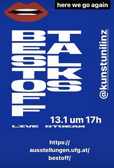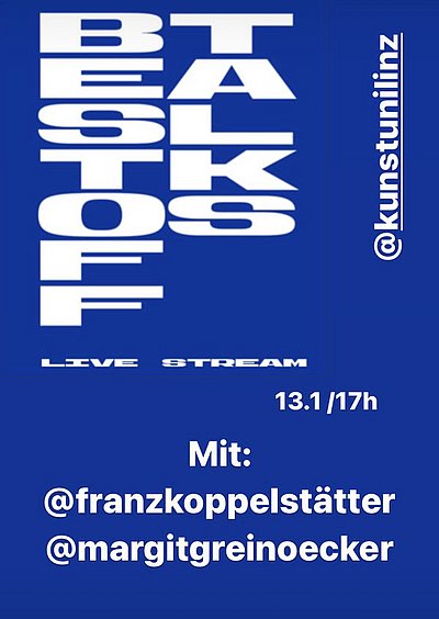 Um das Warten auf die BestOFF-Ausstellung zu verkürzen, laden die KuratorInnen Rainer Zendron und Simone Barlian ein- bis zweimal im Monat zwei externe Gäste (ExpertInnen aus Kunst/Architektur/Design-Institutionen sowie ExpertInnen aus der freien und Off-Space-Szene) und vier beitragende KünstlerInnen und GestalterInnen der BestOFF 2020 zu einem interdisziplinären Podiumsgespräch, welches ZuseherInnen im Live Stream verfolgen können.