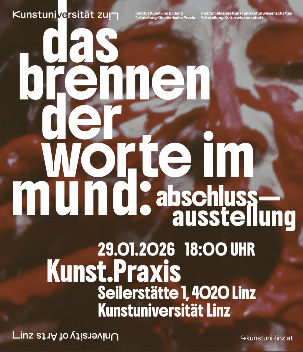 Die Abteilungen Künstlerische Praxis und Kunstwissenschaft laden herzlich zur Abschlussausstellung das brennen der worte im mund ein, einem interdisziplinären Projekt von Studierenden der Kunstuniversität Linz.