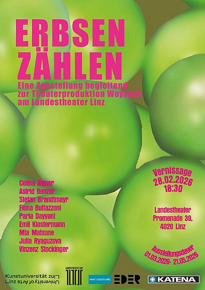 Anlässlich der Aufführung des Theaterstücks Woyzeck findet im Landestheater die Ausstellung ERBSEN ZÄHLEN statt. Sie ist von 28. Februar bis 21. Mai 2026 im Foyer des Schauspielhauses zu den regulären Öffnungszeite zu sehen.