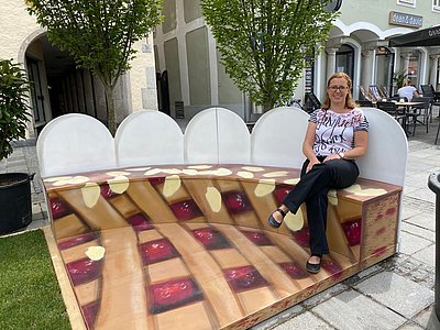 Astrid Starrermayr, Absolventin der Kunstuniversität Linz, schuf die Linzer Tortenbank, welche aktuell in der "Stadtoase" am Linzer Hauptplatz zum Verweilen einlädt.