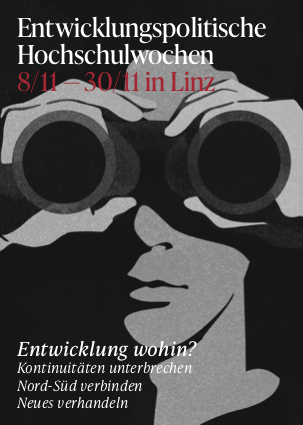 Die Veranstaltungsreihe zum diesjährigen Thema Entwicklung wohin? Kontinuitäten unterbrechen - Nord-Süd verbinden - Neues verhandeln bietet Podiumsdiskussionen, namhafte Referent*innen, Workshops, Filmvorführungen u.v.m. Es wird unter anderem über globale Gerechtigkeit philosophiert, den Verlierer*innen und Gewinner*innen der internationalen Handelspolitik auf den Grund gegangen und Wissen "dekolonisiert".