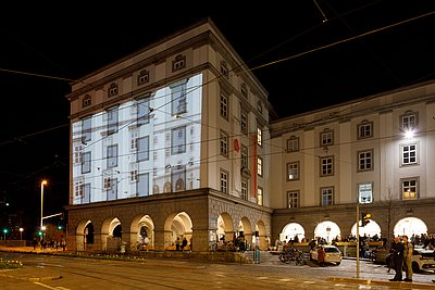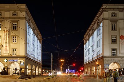 8. September 2023, 21.15 Uhr Kunstuniversität Linz, Fassade Hauptplatz 6 und 8, 4020 Linz