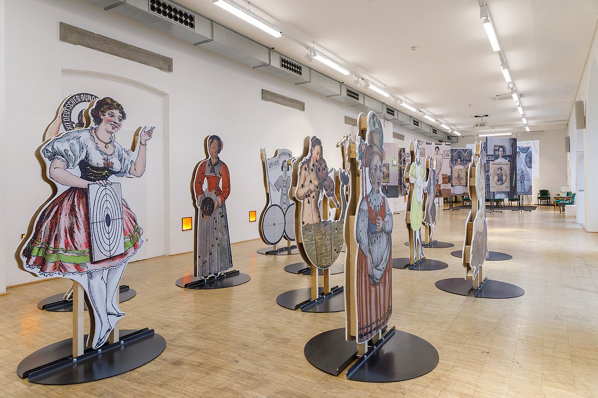 FRAUEN*ZIMMERSCHIESSEN untersucht die tief in der österreichischen Identität verankerte Kulturgeschichte des Schießens und Jagens. In Rahmen einer Recherche entdeckte Elisa Andessner historische Schützenscheiben und Ansichtskarten, die von Patronen durchlöcherte Frauendarstellungen zeigen und das Liebeswerben mit dem Schießen auf Frauen* illustrieren. Die Ausstellung holt diese Fundstücke aus den Archiven und stellt sie anhand von Fotoarbeiten, Videos und Objekten in einen zeitgenössischen Diskurs über geschlechterspezifische Gewalt.