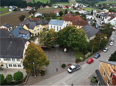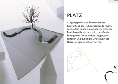 Stefan Almesberger hat sich sehr intensiv mit dem Platz und der Licht- und Schattenwürfe im Laufe des Tages auseinandergesetzt und das Verhältnis zu den umliegenden Gebäuden beleuchtet. In seinem sehr beeindruckenden ortsbezogenen und konzeptionellen Entwurf entwickelt er aus den Schattenwürfen des Kirchturmes kleine architektonische Elemente, die den Platz strukturieren und möblieren. Er thematisiert dadurch das Verhältnis von kirchlicher und weltlicher Ordnung im Dorf.