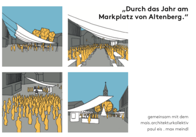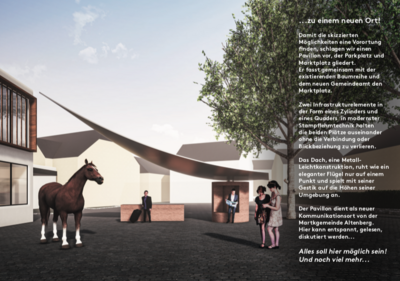 ist ein Projekt, das sowohl eine kleine zeichenhafte, flexible Architektur, als einige Formen von Überdachungen vorschlägt. Es generiert sich aus den Funktionen des Ortes und setzt ein flexibles Konzept für unterschiedliche Bedürfnisse und Nutzer*innen durch das Gemeindejahr. Sie schaffen Laden, Behältnisse, Hüllen und Schutz für Performation und Funktion - für Marktplatz, Platzkonzert, Feldmesse, Flohmarkt oder einfach für den individuellen Aufenthalt am Platz.