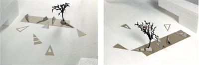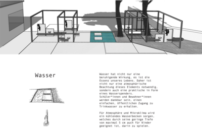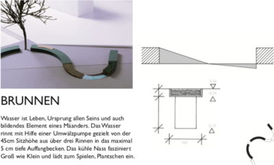 Die geometrische Form nimmt die Optik des Gemeindehauses auf und stellt damit eine formale Verbindung her. Es verwendet eine klare Konstruktion ohne bewegliche Teile (kein Verschleiß) und daher wird in Zukunft wenig Wartung erforderlich sein. Es bietet viele geschützte Sitznischen und lädt zum Verweilen ein. Das Wasserbecken ist ein Anziehungspunkt für jung und alt. Die variablen, jahreszeitlichen bzw. thematischen Gestaltungsmöglichkeiten (Bepflanzung, Sonnensegel, …, ) lassen unterschiedliche, zeitlich begrenzte Schwerpunktsetzungen zu.