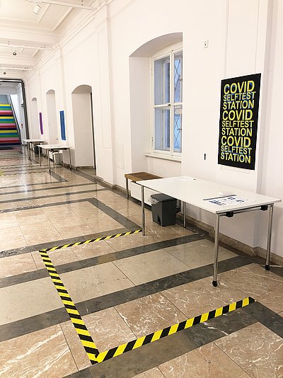The university offers COVID-self-test (nasal) at all locations (testkits are issued to the porters): Download Information sheet (EN)
