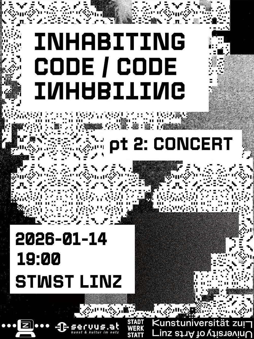 How can an interface like the computer be embodied? How expressive can that interface be? Which techniques and strategies can we use to inhabit uncertainty as a place of experimentation? After a two-day workshop of pondering these questions and learning live-coding tools, a group of old and new live-coders from TOPLAP Linz will present their collaborative experimental algorithmic audiovisual creations in Stadtwerkstatt on Wednesday January 14th at 19:00.