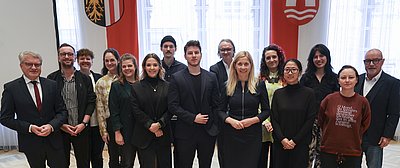 V.l: Bürgermeister Klaus Luger, Stefan Parzer, Anja Baum, Stefanie Altenhofer, Julia Frisch, Sarah Baum, Georg Pinteritsch, Siegfried Kraus, Kulturdirektor Dr. Julius Stieber, Kulturstadträtin Doris Lang-Mayerhofer, Irene G. Villanueva, Xian Zheng, Katharina Halusa, Lisa Spalt, Gemeinderat Stefan Giegler