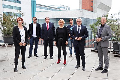 Bürgermeister Klaus Luger und Mitglieder des Linzer Fab City Konsortiums – Kathrin Obernhumer, Werner Arrich / beide GRAND GARAGE, Linz AG-Generaldirektor DI Erich Haider, Kunstuni-Rektorin Mag.a Brigitte Hütter sowie Kunstuni-Professor DI Johannes Braumann – freuen sich über den Beitritt von Linz im weltweiten Fab City Netzwerk.