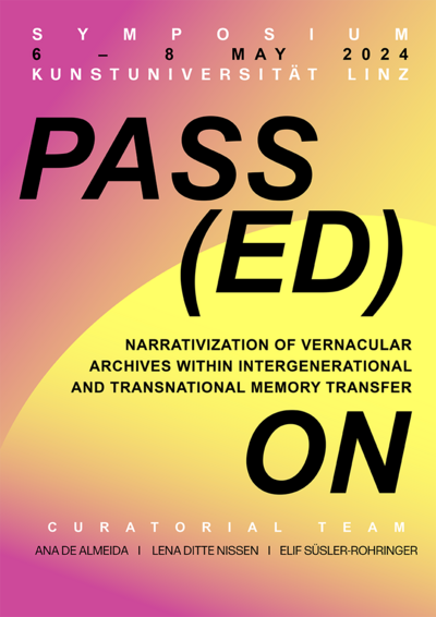 This three-day symposium at the University of Arts Linz, Austria, deals with vernacular and family archives from the 20th century. Throughout three panels and a round table, we present different academic and artistic research projects that investigate distinct modes of intergenerational and transnational memory transfer. The archives they deal with are addressed as places of storage, of consignment and visibility, but also of concealment of power over history, histories and discourse. The different research projects and positions assembled in PASS(ED) ON represent a broad spectrum of theoretical and practice-based methodologies of examining archives, stemming from cultural sciences, artistic research and memory studies.