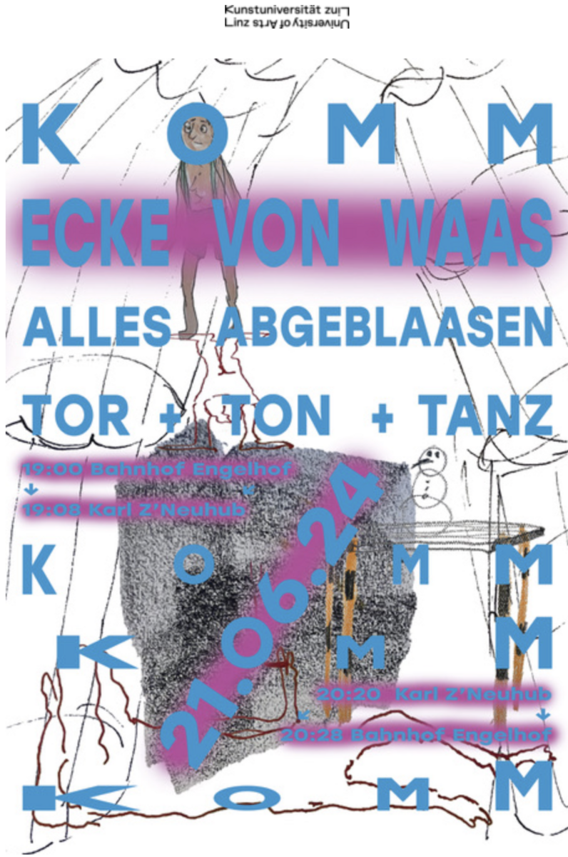 Mittels musikalischer Intervention und ephemerer Skulptur wird von der Bildhauerei der Kunstuni Linz „ein Mehr ist Mehr geflochten. Es wird geblasen, mit Bändern gebraucht, Portale bebeint, alles gleichzeitig, eine Schüttung aus lokalem und persönlichem Brauchtum, bis der Zug abfährt“.