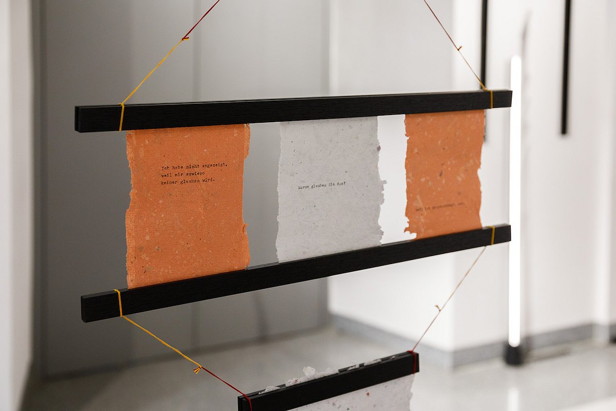 Für diese Installation werden sie zudem zur materiellen Grundlage: Die ausgestellten Papiere sind dünn, durchscheinend, teils lesbar, teils im Verschwinden begriffen. Sie stehen für das Spannungsfeld, in dem Betroffene leben – zwischen Sprechen und Schweigen, Sichtbarkeit und Schutz, öffentlichem Interesse und dem Recht auf Grenzen.