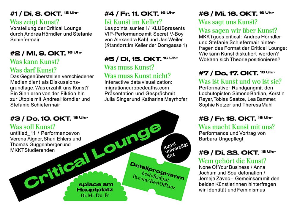 Auf einem Sofa sitzend bietet diese Raum für Diskussion, Reflexion und Dialog mit unterschiedlichen Ansätzen und Programmformaten: Präsentationen, Interventionen, Lesungen, Screenings, Performances, Gespräche uvm. Sie soll einerseits Studierenden, deren Arbeiten nicht ausgestellt wurden, die Möglichkeit geben, diese kritisch zu hinterfragen. Andererseits jedoch auch jenen Personen eine Chance geben, die mit ihrer Kritik in einem Ausstellungskontext ansonsten keine Öffentlichkeit bekämen.