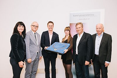 Foto © Florian Voggeneder; von li nach re: Univ.Prof. Dr. Petra Apfalter (Kassenverwalterin der Medizinischen Gesellschaft OÖ), Univ.Doz.Dr. Friedrich Prischl (Präsident der Medizinischen Gesellschaft OÖ), DI Florian Ziller, DI Christine Brameshuber, Univ.Prof. DDr. DI Mag. Josef Kramer (Sekretär der Medizinischen Gesellschaft OÖ), Univ.Prof. Dr. Reinhard Kannonier (Rektor der Kunstuniversität Linz)