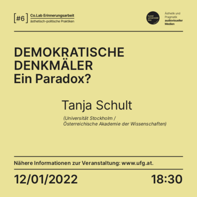 Tanja Schults Vortrag gibt eine kurze Übersicht darüber, wie sich der Denkmalbegriff und mit ihm Seh- und Wahrnehmungsprozesse in den letzten 40 Jahren geändert haben. Anschließend stellt sie Denkmäler vor, die von KÖR – Kunst im öffentlichen Raum Wien – in den letzten 15 Jahren verwirklicht wurden und fragt, wie deren Wirkungsmacht mit Hilfe von Rezeptionsstudien untersucht werden kann.