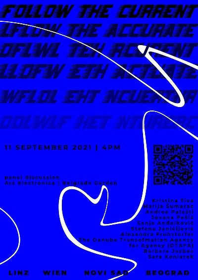 Follow the Current is a panel discussion established among young artists and researches from four cities connected by the current of the river Danube - Linz, Vienna, Novi Sad and Belgrade. The representatives come from group of artists and researches from each city, presenting five main projects: Interface Cult, group show - Sara Koniarek (AT) and Barbara Jazbec (SI/AT), Linz; Woodiana Oracle and Anatomy of Fatberg - Alexandra Fruhstorfer (AT), Lena Violetta Leitner (AT), Ege Kökel (AT/TR), Solmaz Farhang (UK/IR/AT), Vienna and Sanja Anđelković (RS), Jovana Pešić (RS), Andrea Palašti (RS), Novi Sad; Aerosonar and Digital Prayer - Marija Šumarac (RS), Belgrade. The moderator and creator of this panel discussion is Kristina Tica (RS/AT), Belgrade - Linz, also author of Digital Prayer.