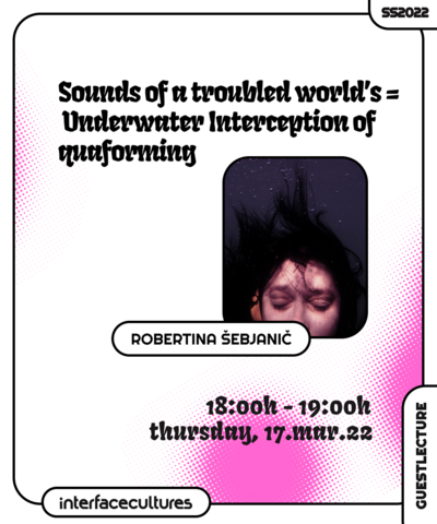 Robertina Šebjanič will talk about her research-based art practice that is focused on the aquatic environments. Her art-sci-tech projects are often realized in collaboration with others, through interdisciplinary and informal integration in her work. She turns the results of her research into installations, performances, and music albums. In the lecture she will present about her art - scientific research, working on the field trips and how she is combining all these different inputs into artworks.