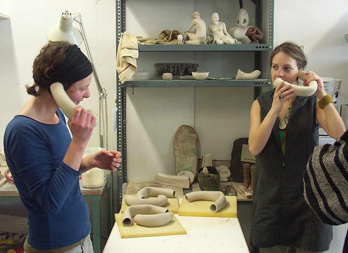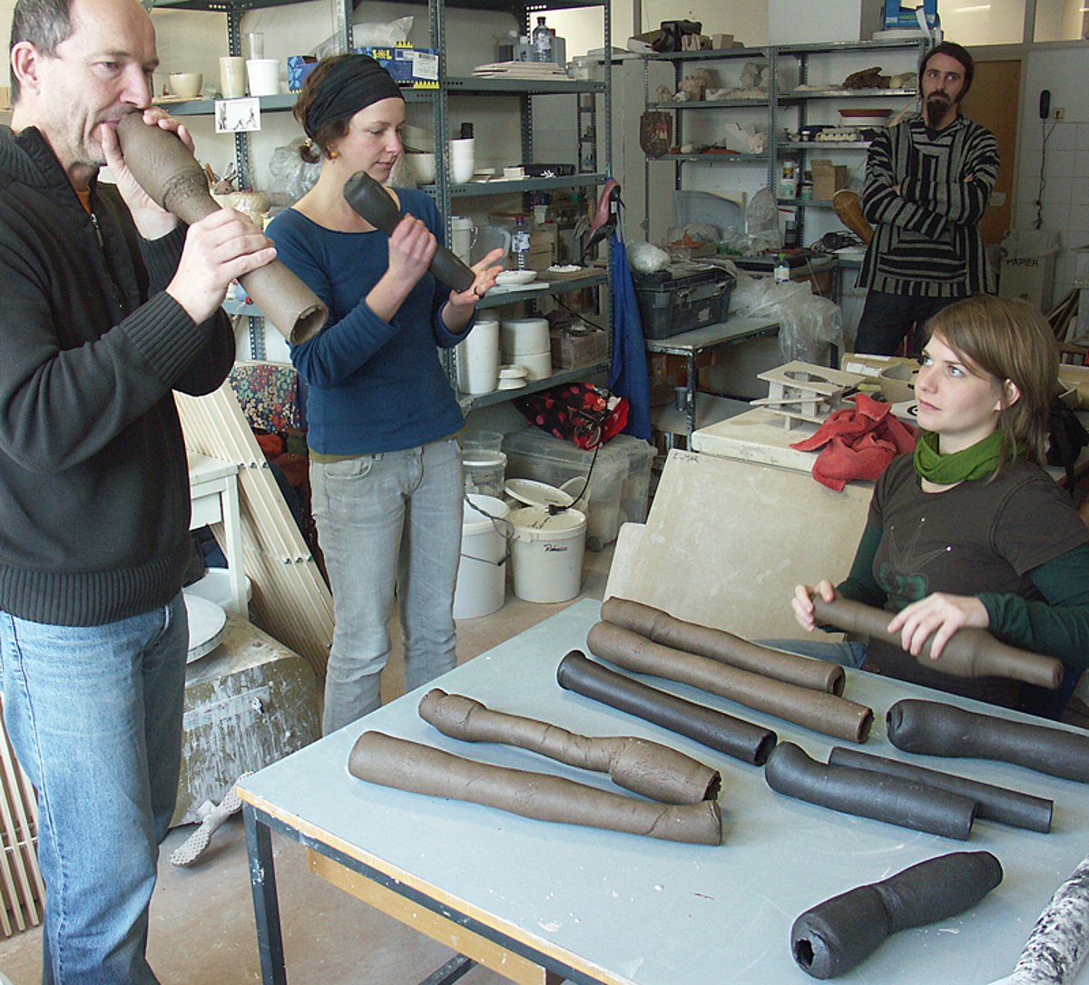 Davon inspiriert untersuchten Studierende der keramischen Studienrichtungen im Semesterprojekt "Hörgeräte" klangliche Qualitäten keramischen Materials, indem sie einige bestimmende Komponenten wie z.B. Tonzusammensetzung, Brenntemperatur, Wandstärkenunterschied und Formgebungsprozess experimentell in Beziehung setzten. Ein spielerischer, manchmal auch humorvoller Zugang wird bei einigen Arbeiten durch das Inbewegungsetzen des „Hörgerätes“ sichtbar und akustisch wahrnehmbar.
