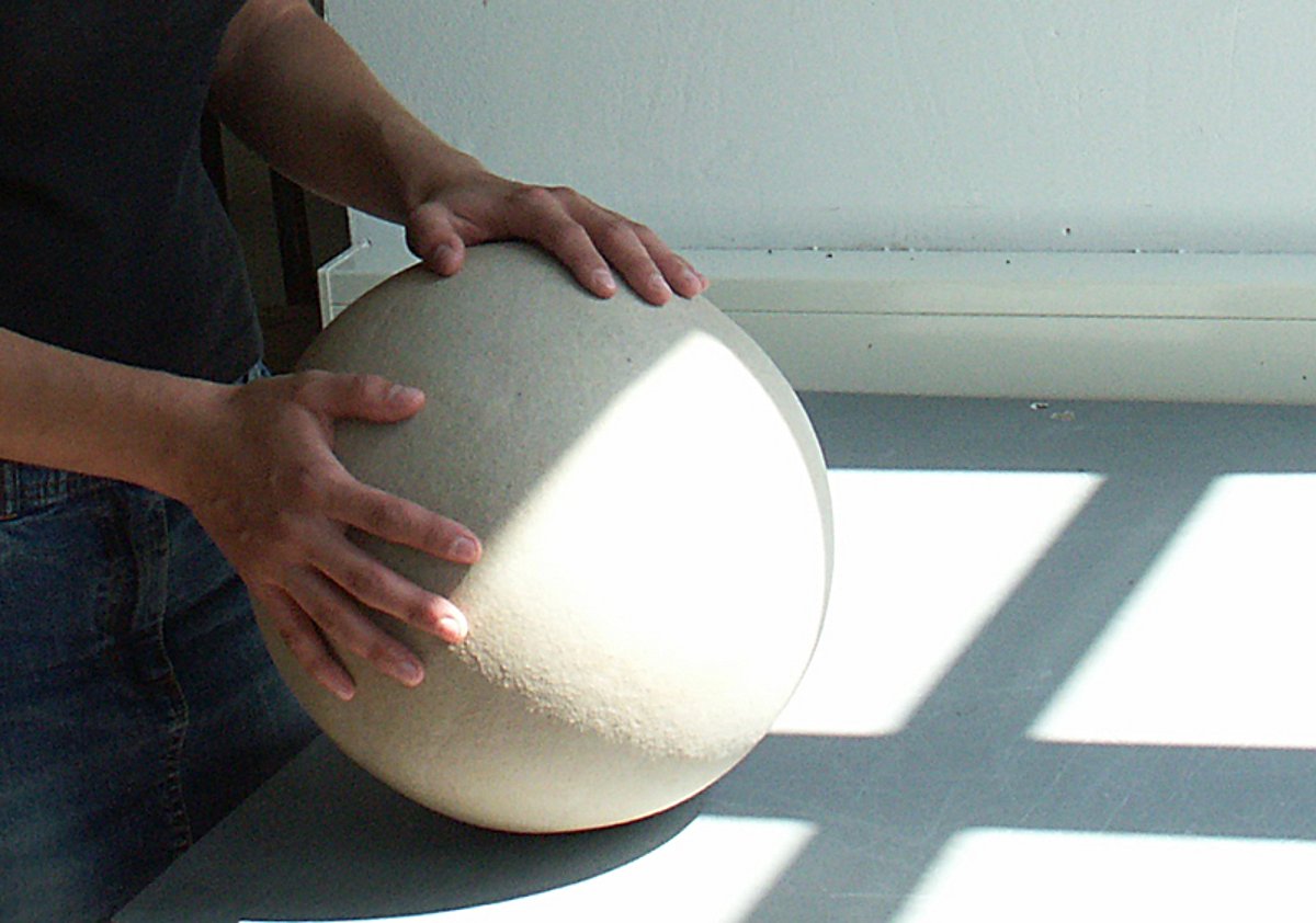 Einen völlig anderen Zugang hatte Elmar Eisenberger, der eine Serie von geschlossenen Kugeln aus Steinzeug formte in denen wiederum kleinere Kugeln – massive, hohle und in unterschiedlichen Größen – eingeschlossen sind. Erst wenn die visuell unspektakulären Kugeln in Bewegung gesetzt werden, ist von dem Verborgenen zu hören.