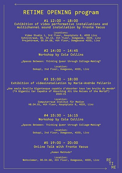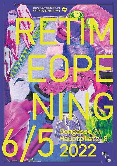 Am Nachmittag und Abend des 6. Mai findet an verschiedenen Orten der Kunstuni die Reihe RETIME (REThInkingMEdia) statt. Die Eröffnung lädt mit Installationen, Workshops und Diskussionen zu Themen wie Sprachfluss, Mensch/Nicht-Mensch und queeres Denken ein. Diese werden von drei Gästen mit unterschiedlichen künstlerischen Hintergründen in einem neu gedachten Medium behandelt.