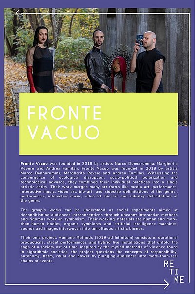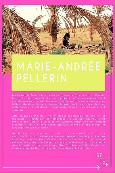 Within the first RETIME event, we intend to open the event series with three external guests that will perform their research subjects in a rethought media. Each guest will cover one topic of the following events: language fluidity, human/ non-human, and thinking queer.