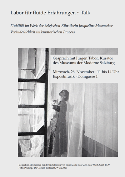 Im Labor für fluide Erfahrungen (Angelika Wienerroither, Büro für nützliche Fiktionenco.lab) ist diesmal Jürgen Tabor, Kurator am Museum der Moderne Salzburg, zu Gast. Am Mittwoch, 26. November, von 11.00 bis 14.00 Uhr sprechen wir darüber, wie eine Ausstellung fluide sein kann.