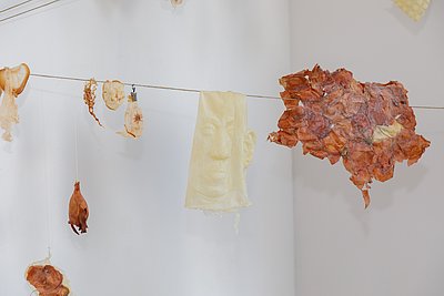 In Magdalena Bergers „Sammelsurium“ treffen Abformungen menschlicher Körperteile auf sorgsam zusammengenähte Zwiebelhäute und Paprika-Innereien; © Mark Sengstbratl