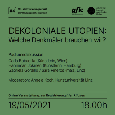 Dekoloniale Utopien: Wie soll mit diesen bereits vorhandenen Denkmälern für Gewalttäter umgegangen werden? Sollen neue Denkmäler errichtet werden? Wie könnte eine dekoloniale Stadt aussehen? Braucht sie Denkmäler? Wofür könnten sie stehen und wie könnten sie aussehen? Diese Fragen wollen wir mit vier Künstlerinnen aus Hamburg, Wien und Linz diskutieren, die sich seit Jahren mit Denkmälern auseinandersetzen.