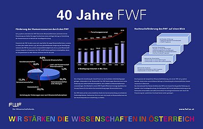 Als Referenz den österreichischen Universitäten gegenüber, stellvertretend für alle Forschungsstätten, wandert nun eine Ausstellung, wo einige verdienstvolle und erfolgreiche FWF-Forschungsprojekte präsentiert werden, von Uni zu Uni. Diverses Informationsmaterial und die Jubiläumsbroschüre liegen zur freien Entnahme auf.