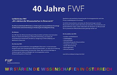 „Der Name und der Wortlaut der Widmung blieben bis zum heutigen Tag unverändert“, so der FWF-Aufsichtsratsvorsitzende Arnold Schmidt in seinem Grußwort der Jubiläumsbroschüre.