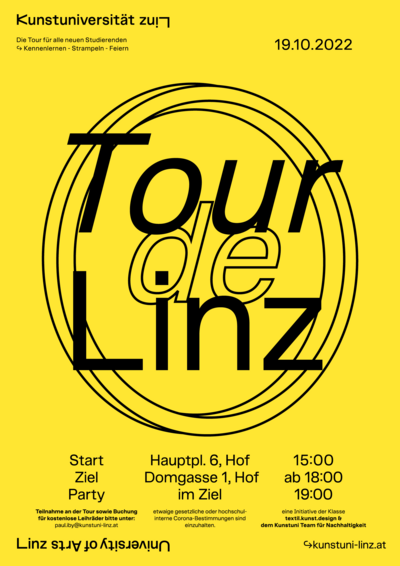 Linz, alias “Linze”, was first mentioned in a document in 799 AD. The city has already experienced a lot, and with you as a new student it will certainly experience even more. To give this new culture of experience the perfect start, we are hereby calling for the first Tour de Linz. A bicycle scavenger hunt that promotes getting to know each other, creative impulses, sustainable locomotion and fast legs. Whether at the tour itself, or at our after-race party including feeding at the finish, winner*s honouring and much more. A must for all new students, organised by the textile·art·design class and the Sustainability Team at the University of Arts Linz with support from all degree programmes.